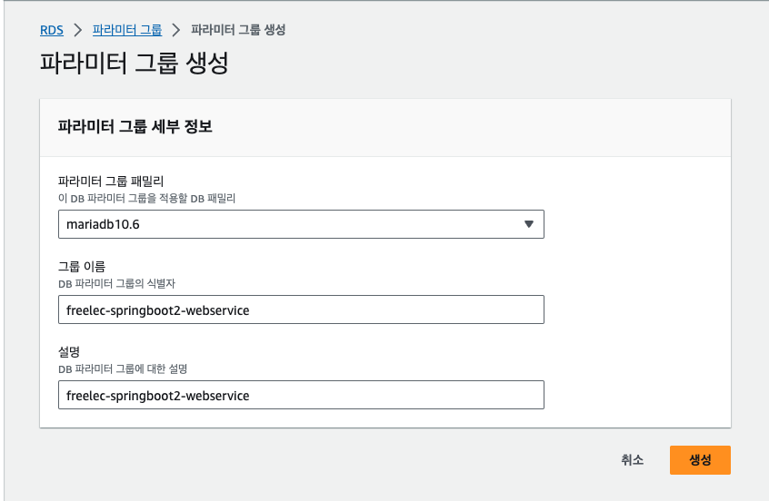 파라미터 그룹 생성에서 방금 생성한 RDS와 버전을 맞춰야한다.