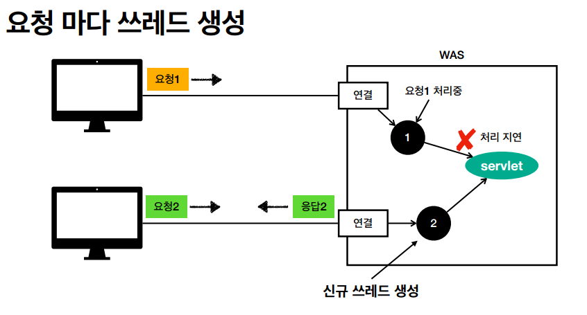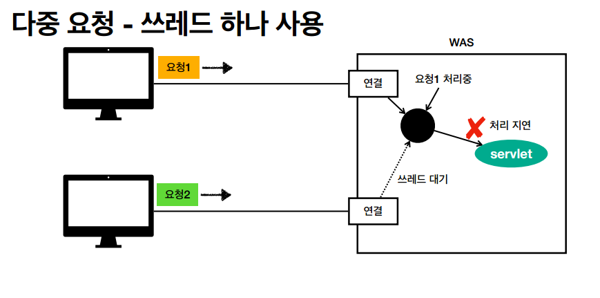 - 다중요청시 요청1이 완료되기까지 요청2가 대기해야한다.