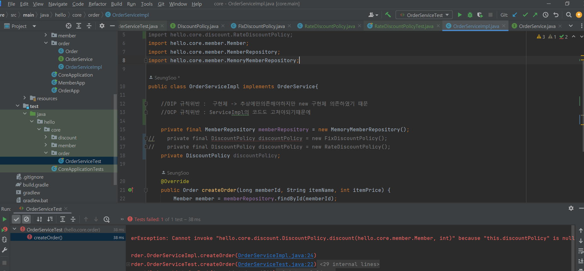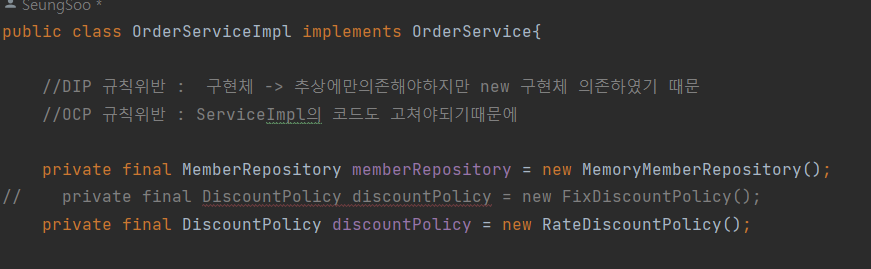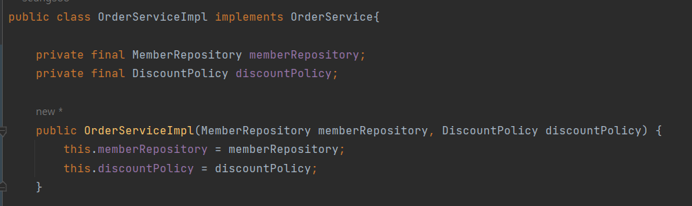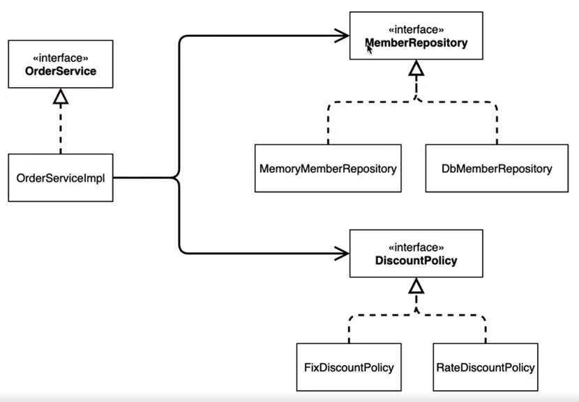 - 'OrderServiceImpl'은 'MemberRepository'와 'DiscountPolicy'에 의존한다는 것을 알 수 있다.